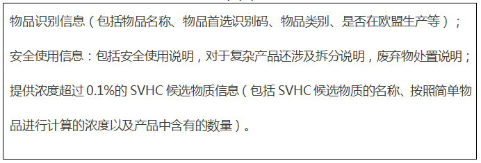 另外,根據(jù)最新修訂的歐盟“廢棄物框架指令”(WFD指令, Directive 2008/98/EC),ECHA要求從2021年1月5日起,只要物品中REACH SVHC質(zhì)超過(guò)0.1%,無(wú)論其年出口量是否超過(guò)1噸,都必須提交SCIP通報(bào)。